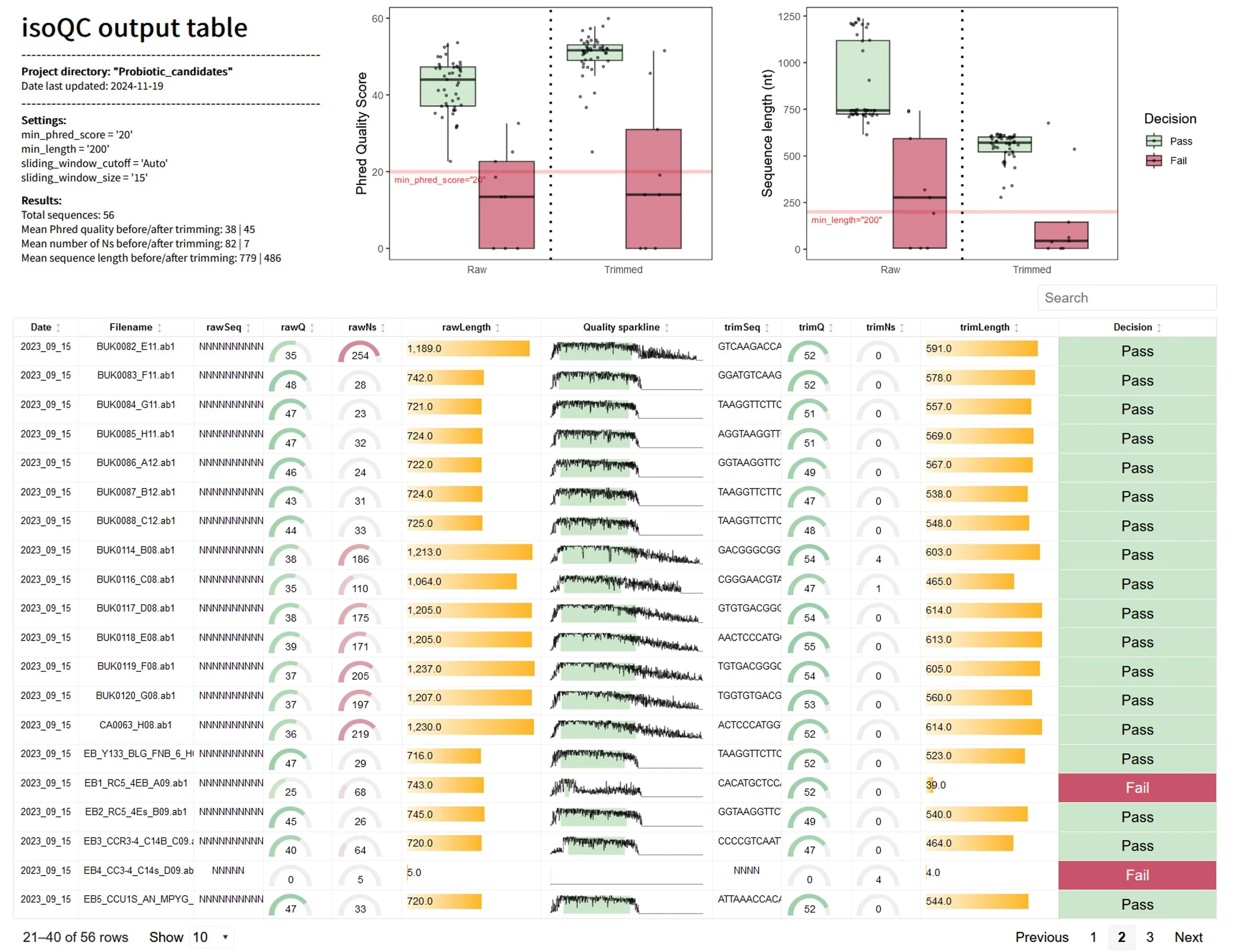 The first step in working with sequence data is cleaning it up—trimming low-quality regions, flagging ambiguous bases, and making sure only the best data moves forward. With isoQC, isolateR handles all of this automatically. You just point the tool to your .ab1 files, and isoQC processes them in batches, generating clean, trimmed sequences and interactive summaries so you can quickly see what passed and what didn’t. When I was isolating bacteria from fecal samples, isoQC saved me hours of manual trimming and quality checks. It meant I could spend more time asking questions about my data and less time wrestling with it. If you’re looking for your next probiotic superstar, this step ensures you start with high-quality candidates.