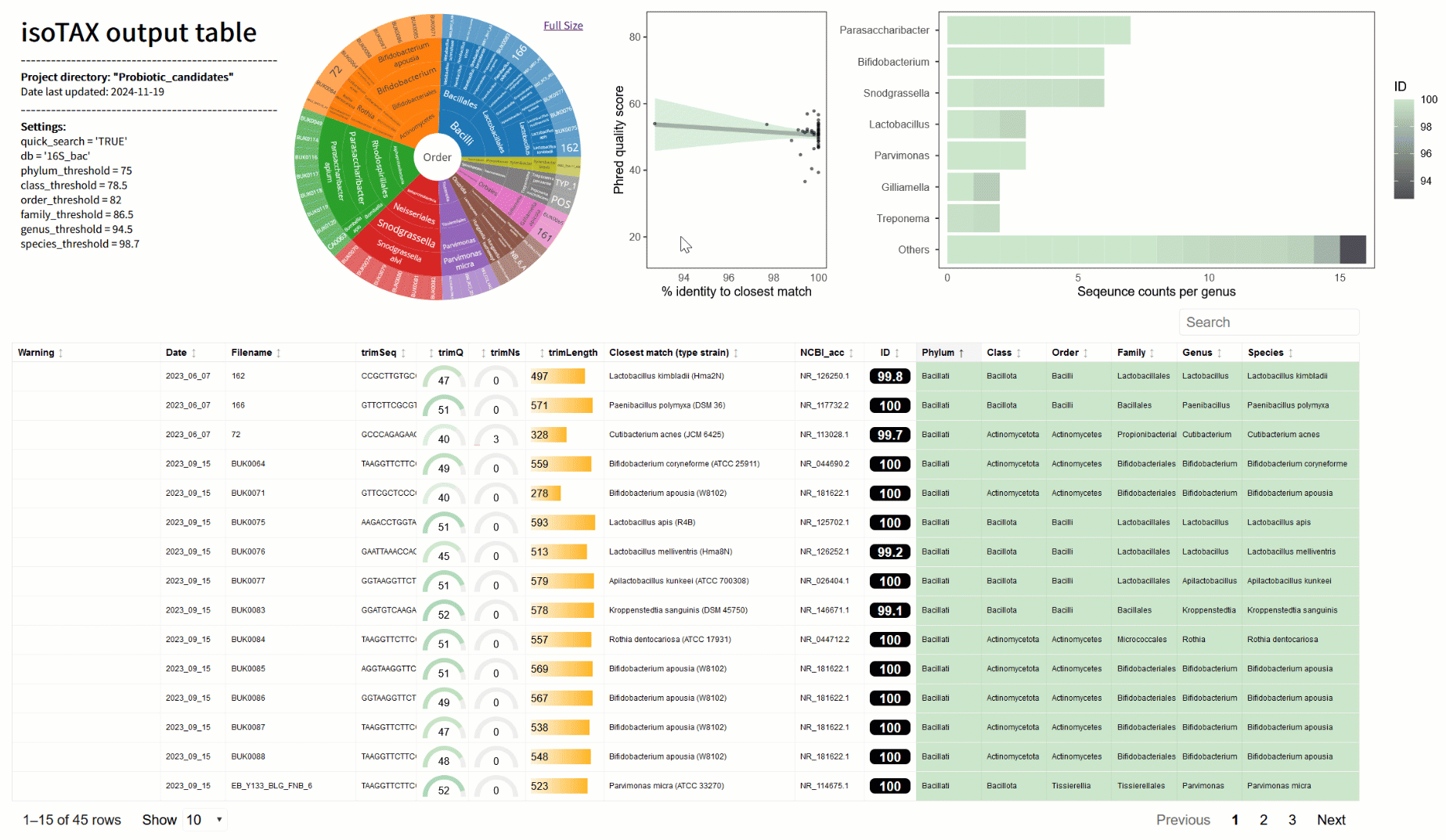 One of the biggest frustrations I’ve faced is figuring out what my sequences actually represent. BLAST is great for a quick look, but it often matches to incomplete or misclassified data (2). With isoTAX, isolateR takes a different approach, using precise global alignment to type strain databases. This means your results are more accurate and reliable—and they comply with the latest international nomenclature standards (e.g., LPSN (3)). Even better, isoTAX works with more than just 16S rRNA. Whether you’re studying fungi (with ITS) or chasing down higher resolution for bacteria (e.g., using cpn60 (4)), you can tailor the tool to your research. isolateR can also help in probiotic research, for example you can quickly identify strains from gut samples or fermented foods, flag potentially novel species, and get right to the exciting work of understanding their mechanisms in the lab.