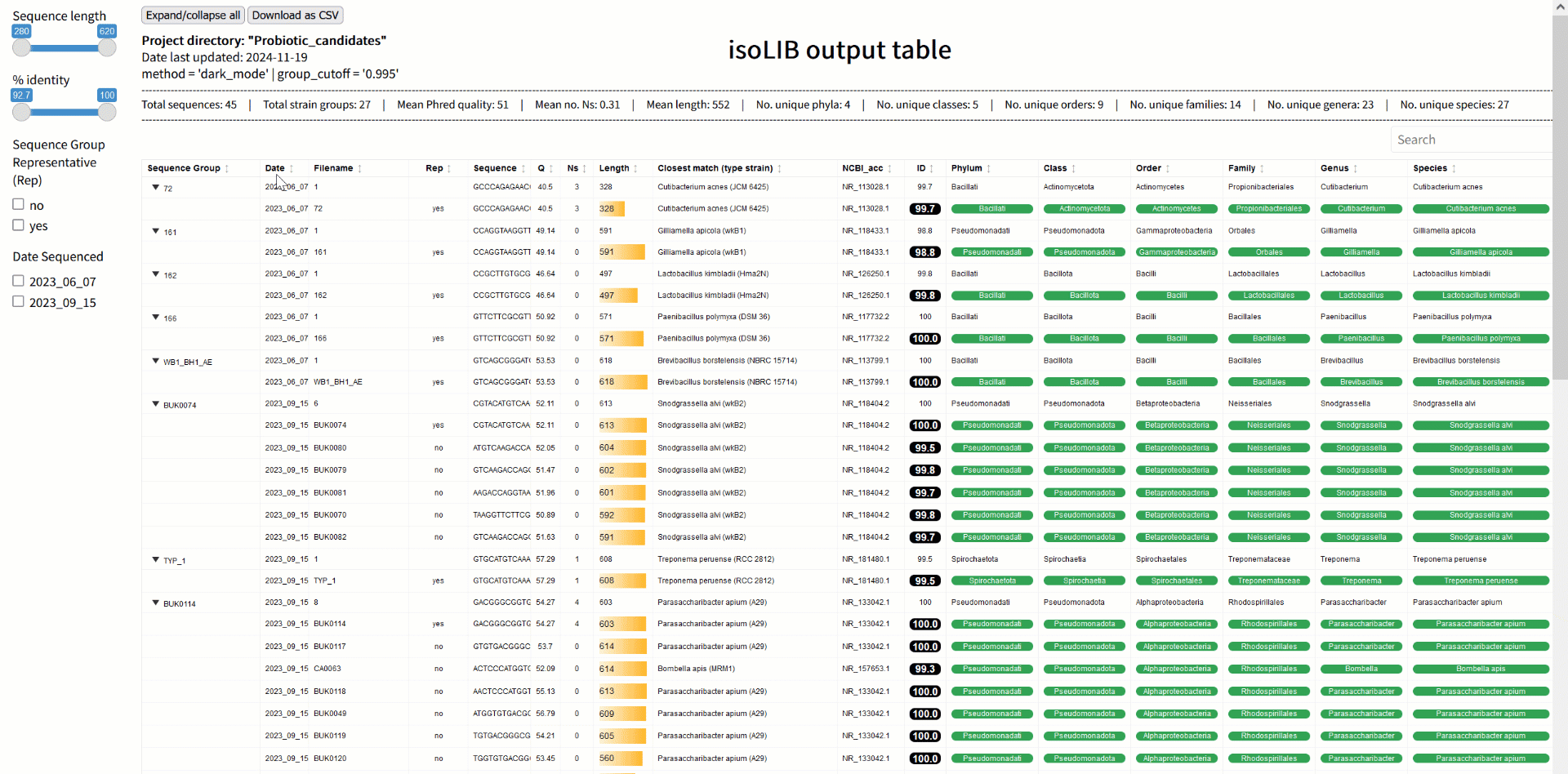 Once sequences are processed and classified, the next challenge is organizing them into a meaningful library. The isoLIB function simplifies this by clustering related isolates into groups based on customizable thresholds of sequence similarity. This process eliminates redundant entries, highlights unique strains, and produces an interactive, searchable HTML library. What sets isoLIB apart is its ability to integrate new isolates into existing libraries, enabling researchers to build dynamic, evolving collections. For those studying probiotics, isoLIB is a powerful tool to document strain-level diversity, pinpoint novel candidates, and compare isolates across different environments or conditions. Whether you're screening microbes from the gut, soil, or fermented foods, isoLIB provides an elegant solution for managing your findings.
