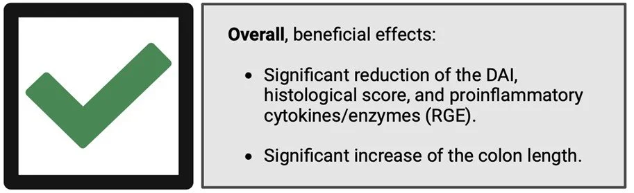 The disease activity index (DAI) evaluates the clinical progression of colitis using a composite score system. Generally, it is calculated as the sum of body weight loss, faecal properties, and haematochezia scores. Our meta-analysis suggests a significant reduction in the DAI in mice with CIC upon postbiotic administration, compared to the untreated group. Additionally, the postbiotic-administered group showed a significant reduction in the histological score. Cumulatively, these findings highlight the effects of postbiotics on reducing the severity of CIC in mice. Moreover, our research underlined the impact of postbiotics in lowering the relative gene expression (RGE) of various proinflammatory cytokines, including IL-1β, IL-6 and TNF-α. Indeed, postbiotics were found to have important effects in suppressing inflammation within the colonic mucosa. For instance, Choi et al. (2019) suggested that crypt destruction is attenuated in the postbiotic-administered group compared to their colitis-only group.