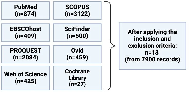 Figure 1. To identify the eligible articles for the meta-analysis, eight databases were searched which identified a total of 7900 records. After applying the inclusion and exclusion criteria, 13 articles were eligible for inclusion. The inclusion criteria were: 1) Primary research articles only, 2) Mice studies only (no age, sex, weight, strain restrictions), 3) Inactivated microbiological biomass was required to be present during the progression of the experiment (based on the ISAPP’s postbiotic definition). Studies that used purified metabolites were excluded.