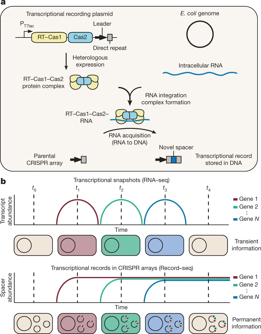 Schmidt F, Cherepkova MY, Platt RJ. Transcriptional recording by CRISPR spacer acquisition from RNA. Nature. 2018; 562(7727):380-385.