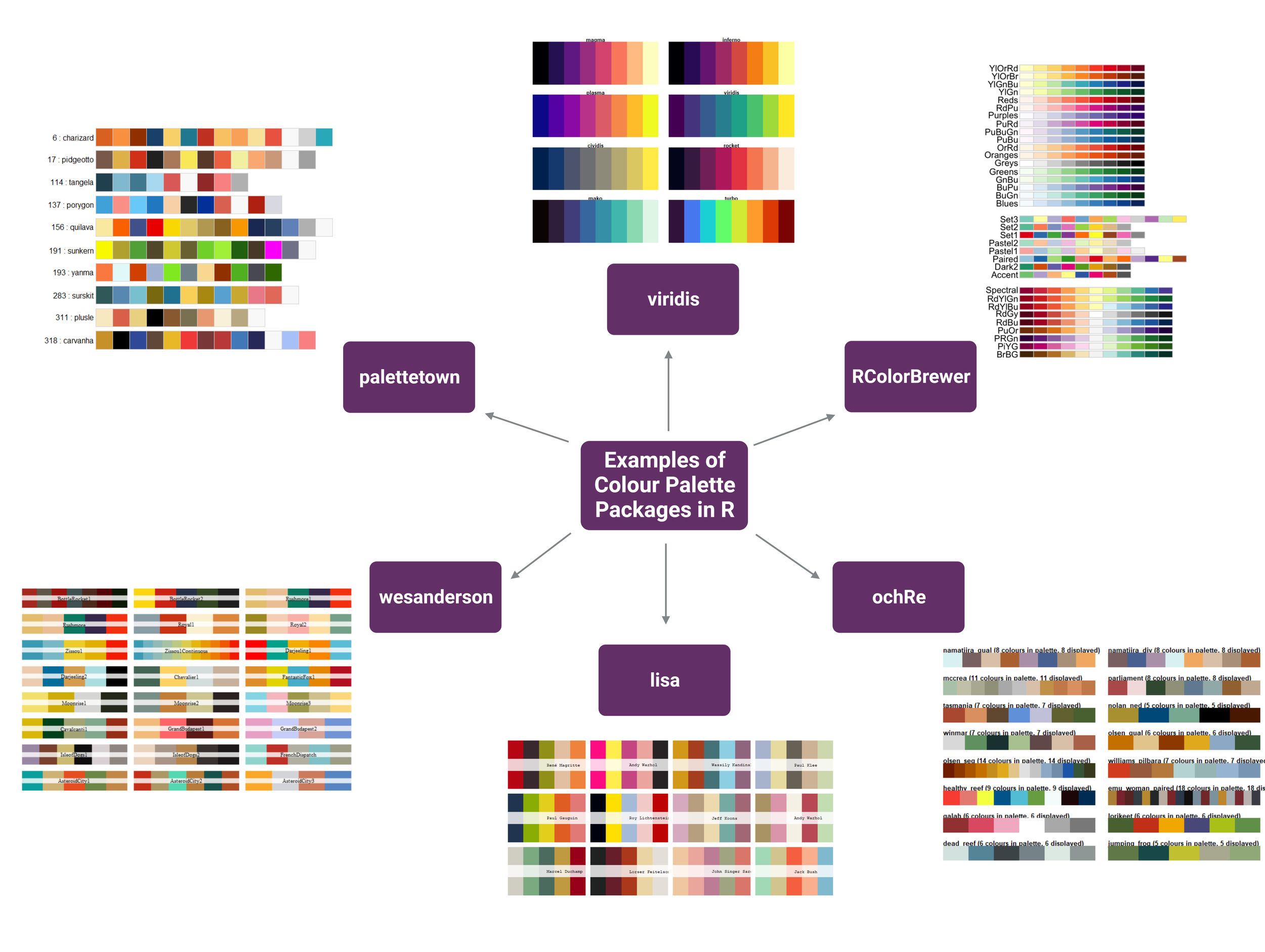 Some examples of colour palettes (Figure 1) are wesanderson, RColorBrewer, palettetown, viridis, and ochRe.